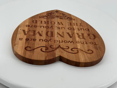 Have a special grandma? Celebrate her with this charming heart-shaped charcuterie board crafted from solid cherry wood. Featuring a personalized engraved message and convenient wall-hanging keyhole, it's both functional and decorative. At 12.5 x 13 inches, there's ample space for displaying her favorite treats, cookies, or charcuterie. The thoughtful design makes it a meaningful gift she'll treasure for years. Available in multiple grandma titles—Grandma, Nana, Gigi, Oma, Mimi, and more—so you can choose the name that fits perfectly. A beautiful blend of practicality and sentiment that transforms any kitchen or dining space into a warm tribute to the special woman in your life.