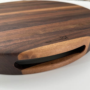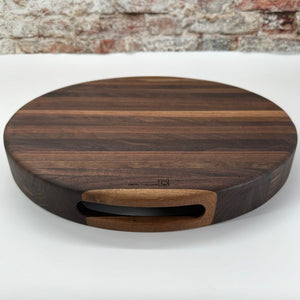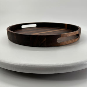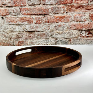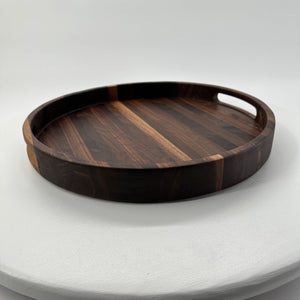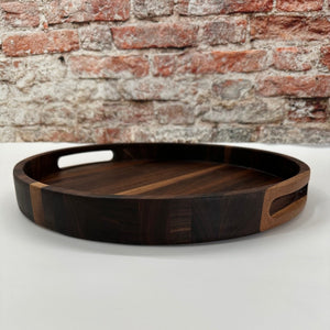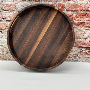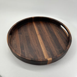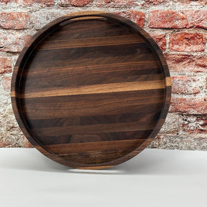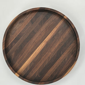 Expertly crafted from a 2" thick walnut slab, this 15" diameter tray boasts a sleek and sturdy design perfect for entertaining or large fruit or veggie tray. The hollowed out interior allows for easy serving, while the 1 3/4" height provides ample room for any desired  contents. Perfect for adding a touch of elegance to any table setting, coffee table, or foyer.