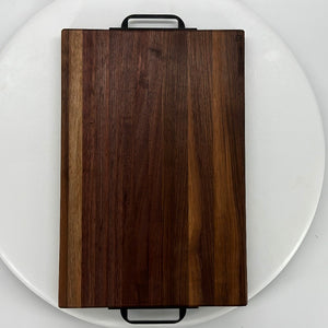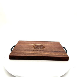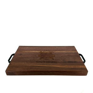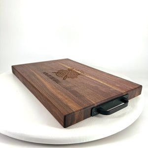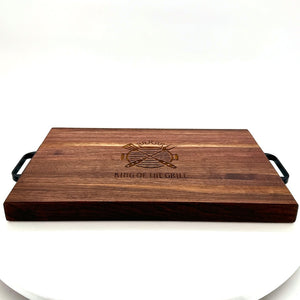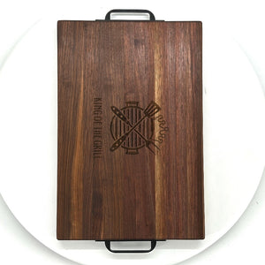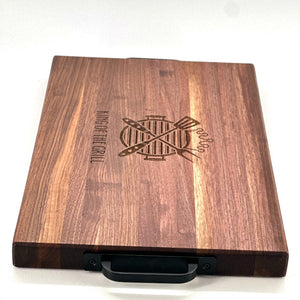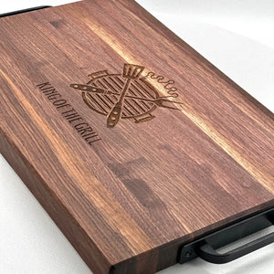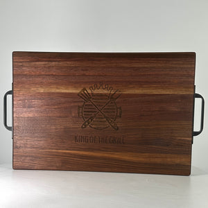 Have a grill person? We've got you covered with our solid walnut edge grain constructed cutting board. Perfect for grilling, charcuterie, & cutting board use. Generously sized (18 X 12 X 1.5 ") to accommodate a variety of uses, and it's reversible, doubling the functionality. Attractive black handles (in sturdy Zinc Alloy) add a touch of class to this beautiful piece. A perfect gift for Dad this year, but it would really suit anyone who loves to barbecue or smoke food. This is an exceptional value for an engraved walnut board.