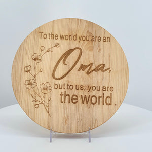 Have a special Oma? Celebrate her with our charming charcuterie board crafted from solid Maple. Featuring a personalized engraved message and convenient wall-hanging keyhole, it's both functional and decorative. At 12 inches in diameter, there's ample space for displaying her favorite treats, cookies, or charcuterie. The thoughtful design makes it a meaningful gift she'll treasure for years. Available in multiple grandma titles—Grandma, Nana, Gigi, Oma, Mimi, and more—so you can choose the name that fits perfectly. A beautiful blend of practicality and sentiment that transforms any kitchen or dining space into a warm tribute to the special woman in your life.