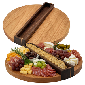 The Cracker Keeper Charcuterie Board is an ingeniously designed hardwood board that solves the age-old problem of crackers sliding across your spread. Featuring a clever center trough, it keeps crackers perfectly compartmentalized and stable—ideal for olives and other rolling items too. Crafted from beautiful cherry and walnut hardwoods in random widths, it is truly unique piece. Measuring 14 inches in diameter with a total height of 1.75 inches, this original Square Tree Lane design has become a customer favorite for anyone who appreciates both function and artistry in their entertaining essentials.