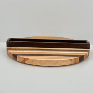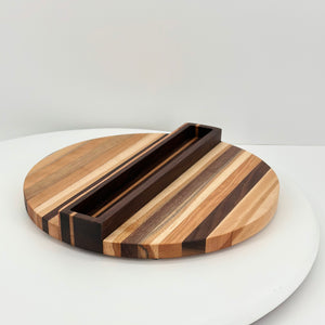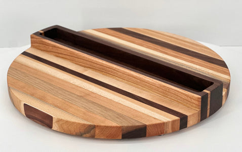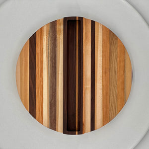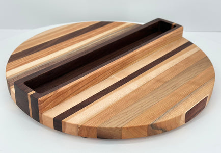 The Cracker Keeper Charcuterie Board is an ingeniously designed hardwood board that solves the age-old problem of crackers sliding across your spread. Featuring a clever center trough, it keeps crackers perfectly compartmentalized and stable—ideal for olives and other rolling items too. Crafted from beautiful cherry, walnut & maple hardwoods in random widths, it is truly unique piece. Measuring 14 inches in diameter with a total height of 1.75 inches, this original Square Tree Lane design has become a customer favorite for anyone who appreciates both function and artistry in their entertaining essentials.