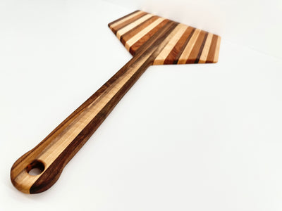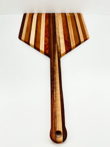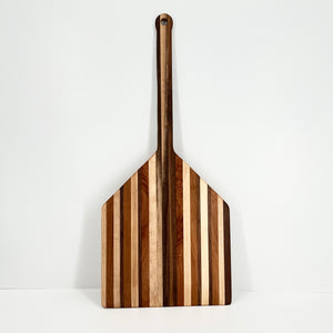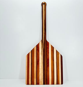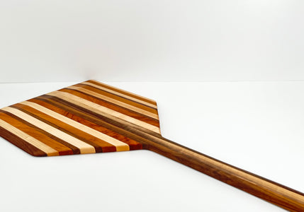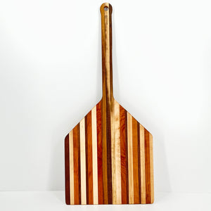 Elevate your pizza-making experience with this stunning handcrafted peel, expertly designed for seamless oven operation. Measuring 35 inches overall with a comfortable 16-inch handle and spacious 16-inch width, it effortlessly accommodates standard pizzas while the tapered end glides smoothly under your creation for easy removal. Meticulously crafted from premium maple, walnut, and cherry hardwoods, each paddle showcases exceptional artisanal quality and natural wood grain beauty. Whether you're a serious pizza enthusiast or casual baker, this functional work of art doubles as striking kitchen décor. An unforgettable gift for the home chef who appreciates fine craftsmanship and authentic cooking tools.